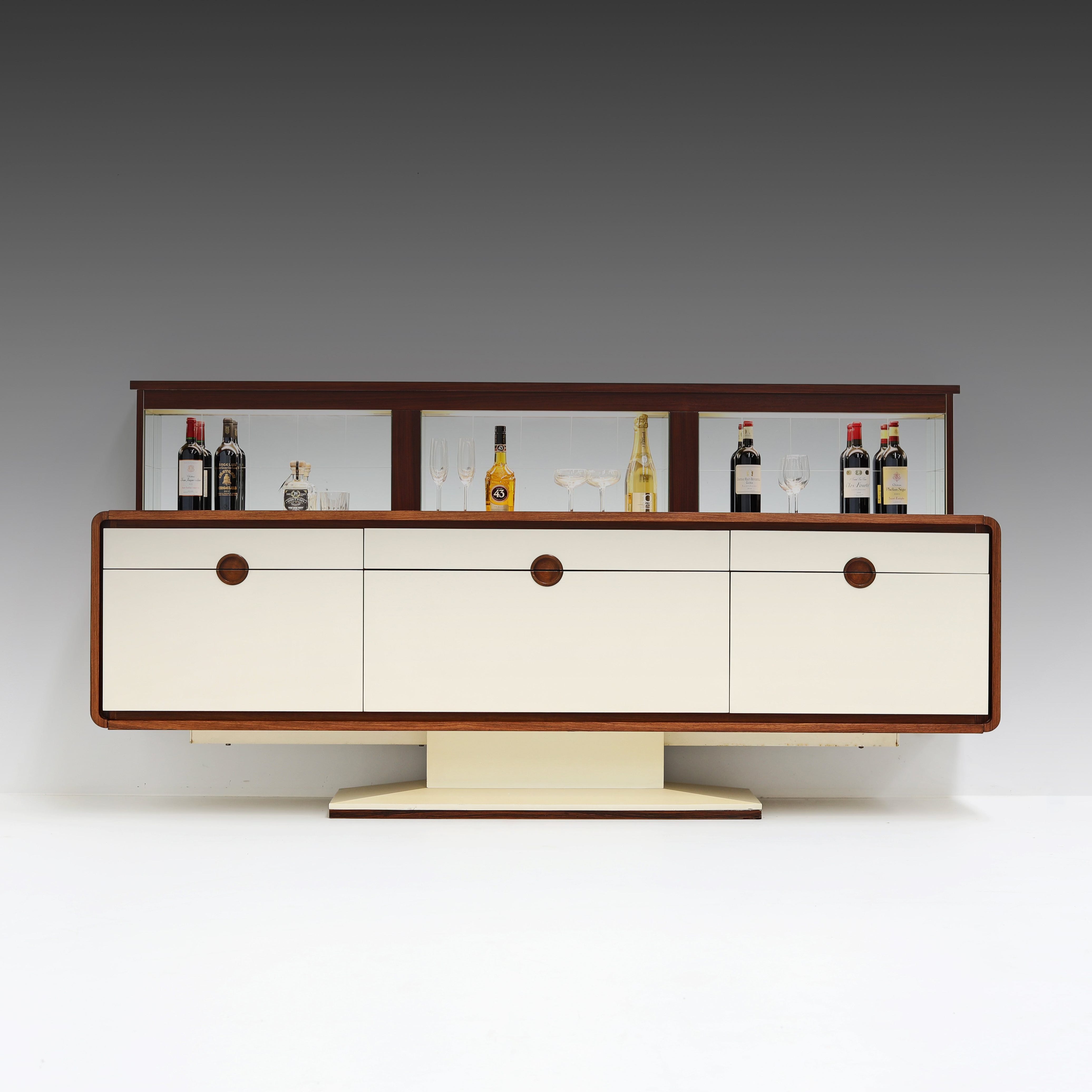 Perhaps the best example I’ve ever seen of this kind of furniture is the Bariomat sideboard by Alfons Doerr, a German designer from the 1960s whose internet presence unfortunately exists almost exclusively in the service of this furniture piece. A futuristic rosewood credenza with laminate doors and a pedestal base, it becomes, with the turn of a key and a flip of the switch, a kind of party palace dry bar, its lighted, mirrored drinks cabinet ascending from a hidden compartment in the rear. (Doerr actually patented this piece in 1968, which is possibly why any information about it exists at all, and it was manufactured by Bariomat in a small series.)