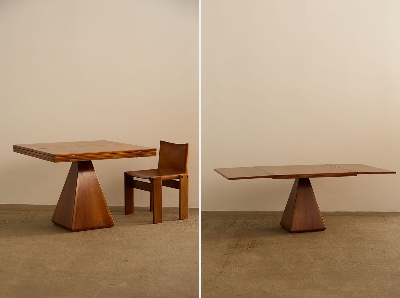 On Galerie Balbach, there’s a dude widening the diameter of a rare, 1920s-era footed table, using a complicated mechanism that seems to involve a belt. On DeStudio, the dealer rolls out an elegant Postmodern container, whose triangle point splits and folds down to create a bar cabinet with a mirrored top (for cocaine?) and a sunken cavity (for liquor). On Mid-Century Friends, the guy swivels out three sections from a round, 1980s-era Skovby table, pushes down the triangular insert hidden inside the table’s central column, then proceeds to deftly pull out three interlocking drop leafs like they’re rabbits in a hat. (In truth, a lot of these videos come from Mid-Century Friends, which is a vintage dealer based in Germany, which makes sense when you realize that all of the best vintage comes from Europe, I’m sorry to report.)