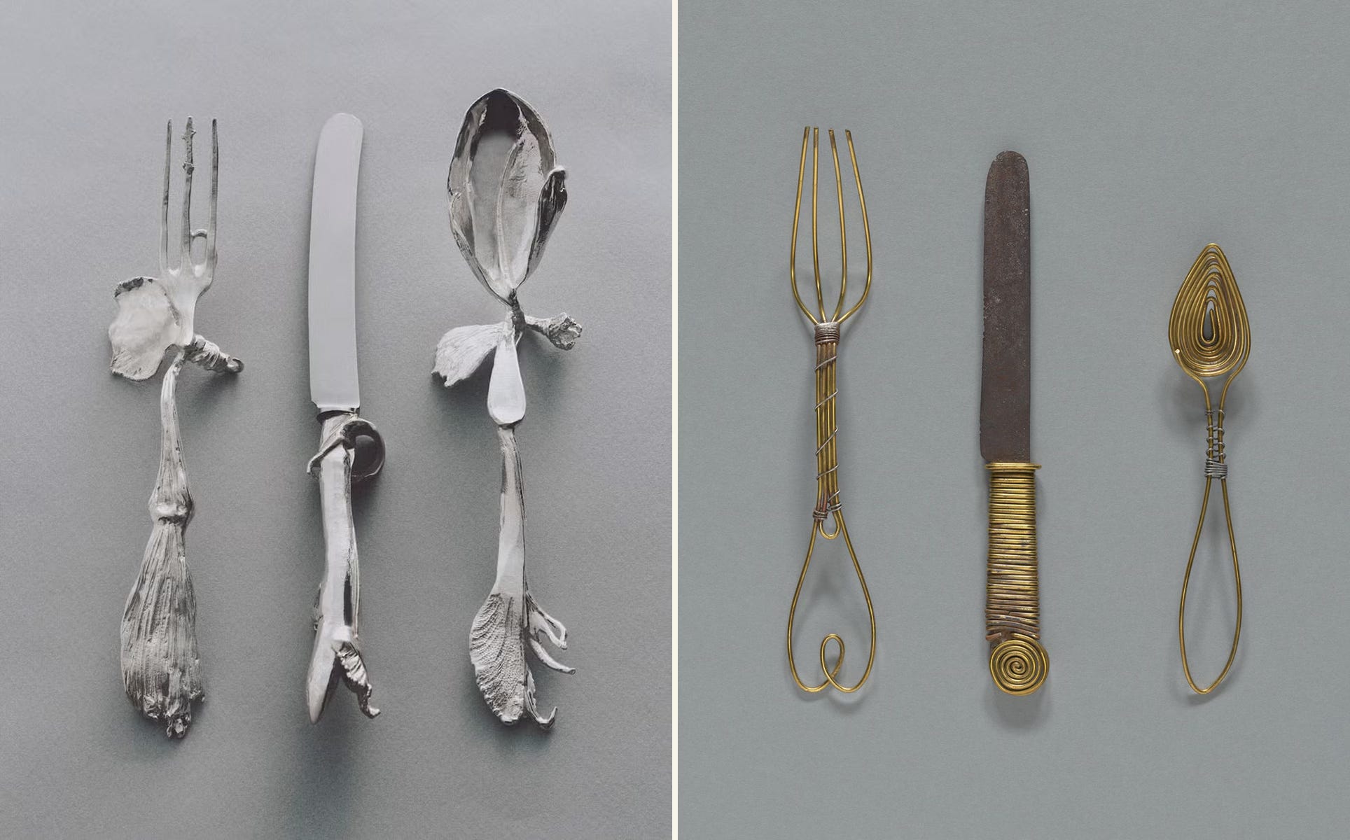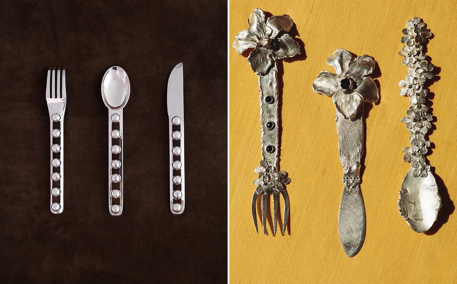 Indeed, there’s a short history of women moving from the jewelry world to flatware, spanning from Vivianna Torun at Georg Jensen (an incredibly undersung silversmith I’ll be exploring more in a later newsletter) to Charlotte Chesnais, the Parisian jeweler who just released a collection with Christofle. And Ngo is right — in addition to Jessi Burch, other contemporary jewelers dipping a toe into the cutlery world include Alice Waese, Suna Bonometti, and Rosh Mahtani, the London-based jeweler behind Aligheri. “There’s also an interesting trend that instead of taking a larger concept and scaling it down — the way that Alessi did in the ‘90s when they were commissioning [primarily male] architects to design flatware — designers are now scaling up,” says Ngo. (This is explored in this excellent search-for-the-perfect-flatware article, though not as exhaustively as I would like!)