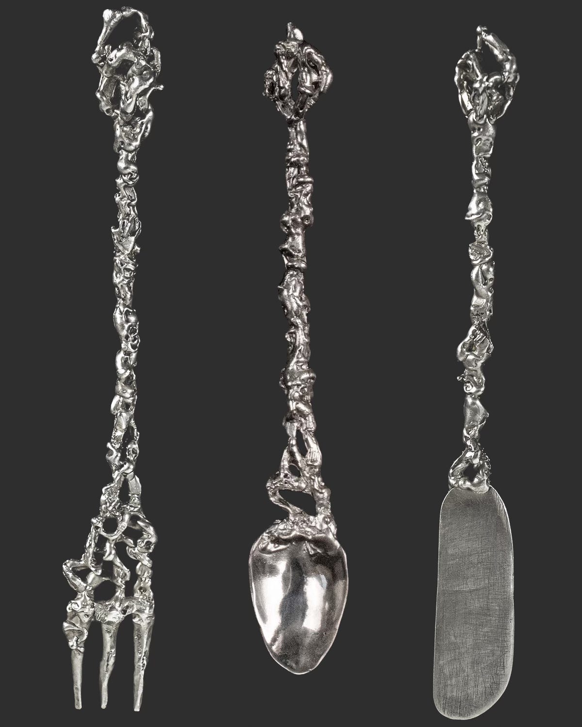 There were the Jessi Burch ones, with their rows of silver-plated tiny balls, inspired by Josef Hoffman’s iconic 1908 chair ($595). There was a set sold at my favorite Chinatown mall shop, Old Jewelry, made by the Mexican atelier of the late modernist William Spratling in a limited quantity each year. ($1,400, but they come with a lifetime guarantee from the atelier; if you think those are expensive, take a look at this complete Spratling service, which sold for $27K in 2020.) There was Jardin, a delicate, floral-embellished trio designed by Conie Vallese in collaboration with Elhanati, studded with black diamonds ($4,200). There were sets that explored silverware’s negative space, by Heath Wagoner ($2,000) and Natalia Criado ($680).