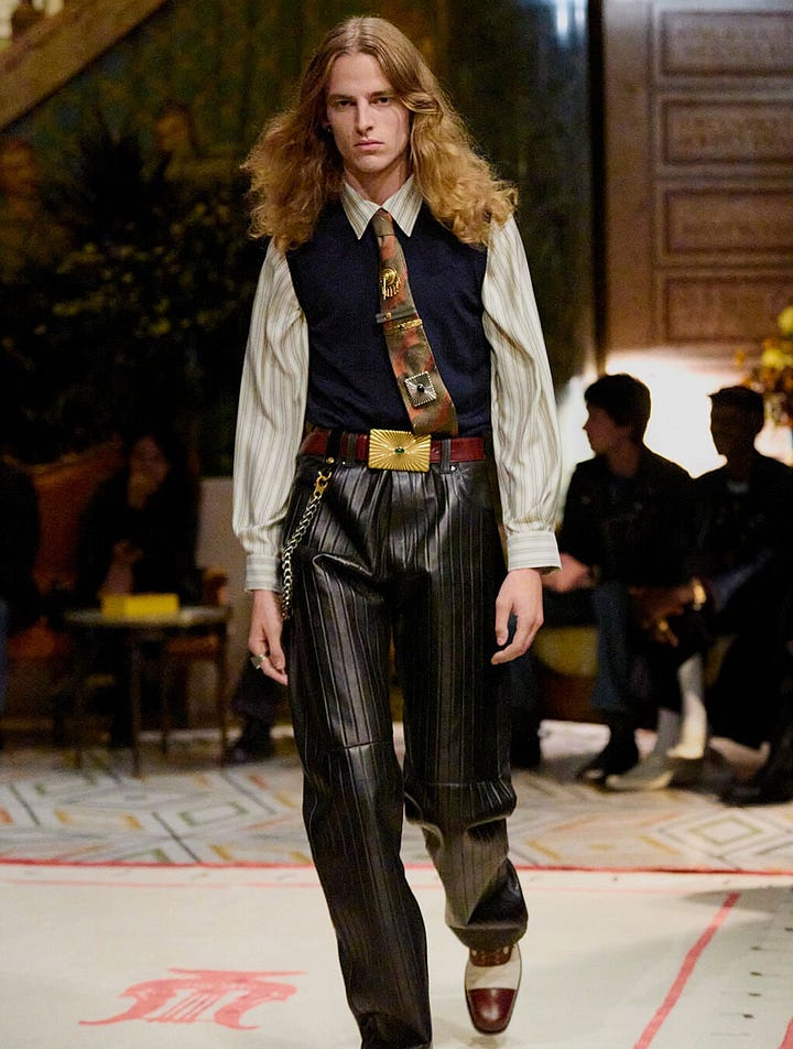 I’m generally not very interested in brooch interpretations by big fashion brands, but I would make an exception for this Wales Bonner one, and, weirdly, this bi-color Japanese wool Tory Burch cardigan that comes with a split sleeve that can wrap around like a scarf, fastened by a tulip-shaped brooch.