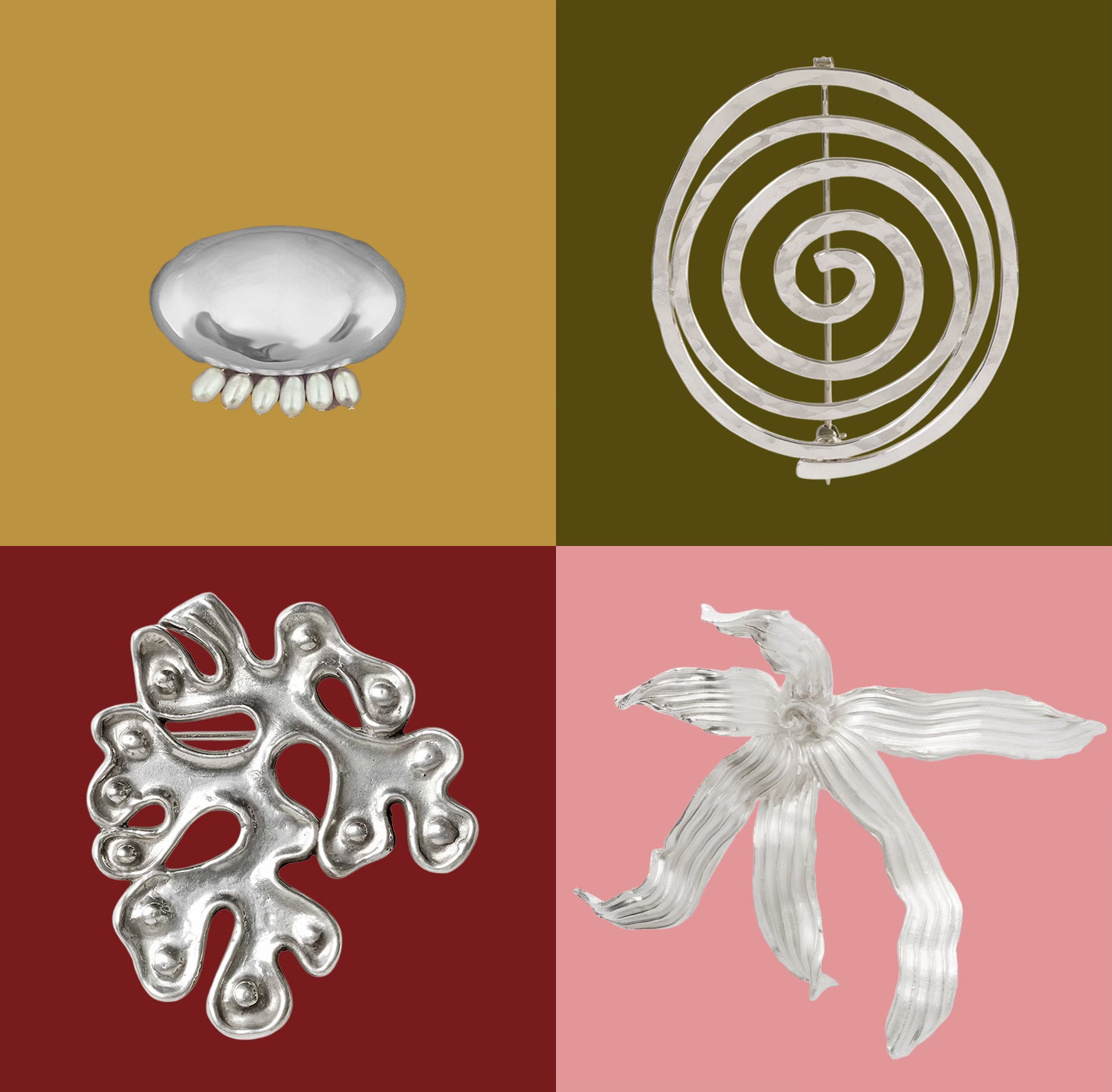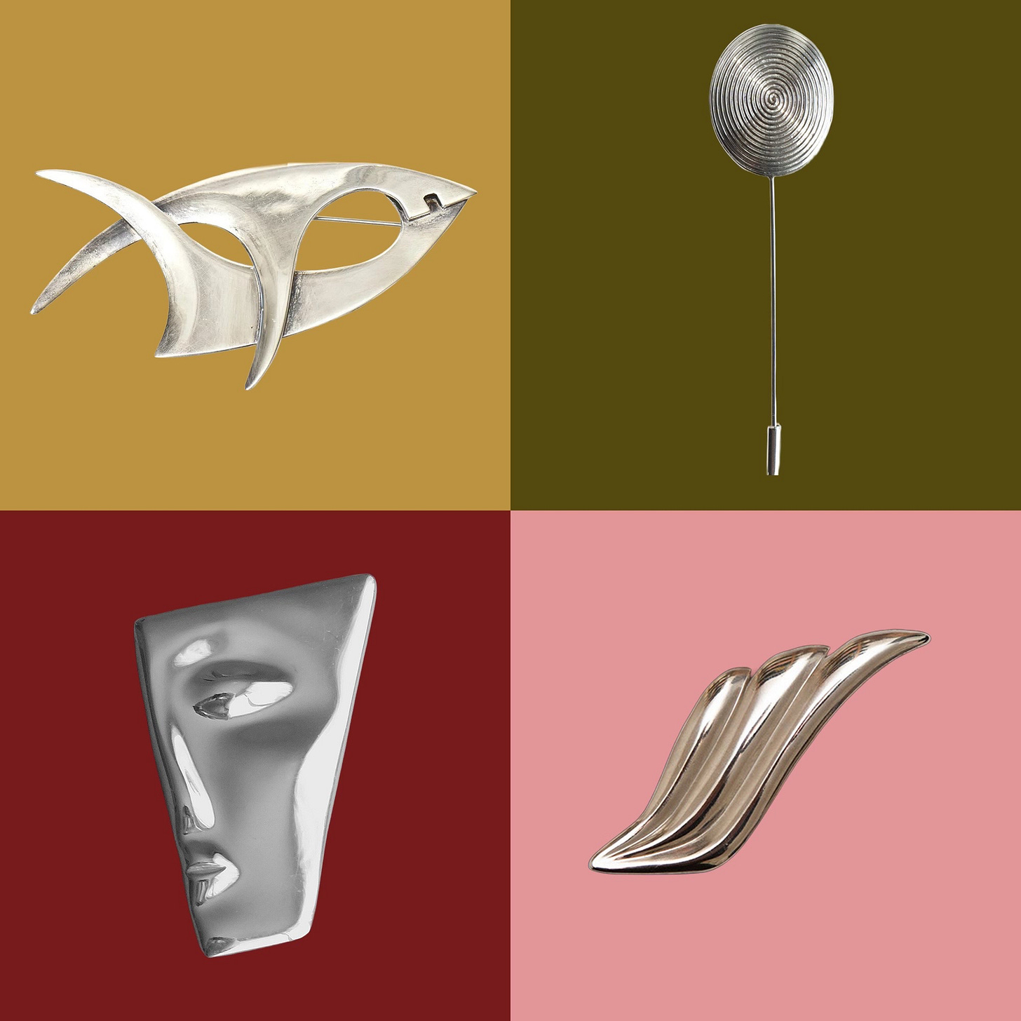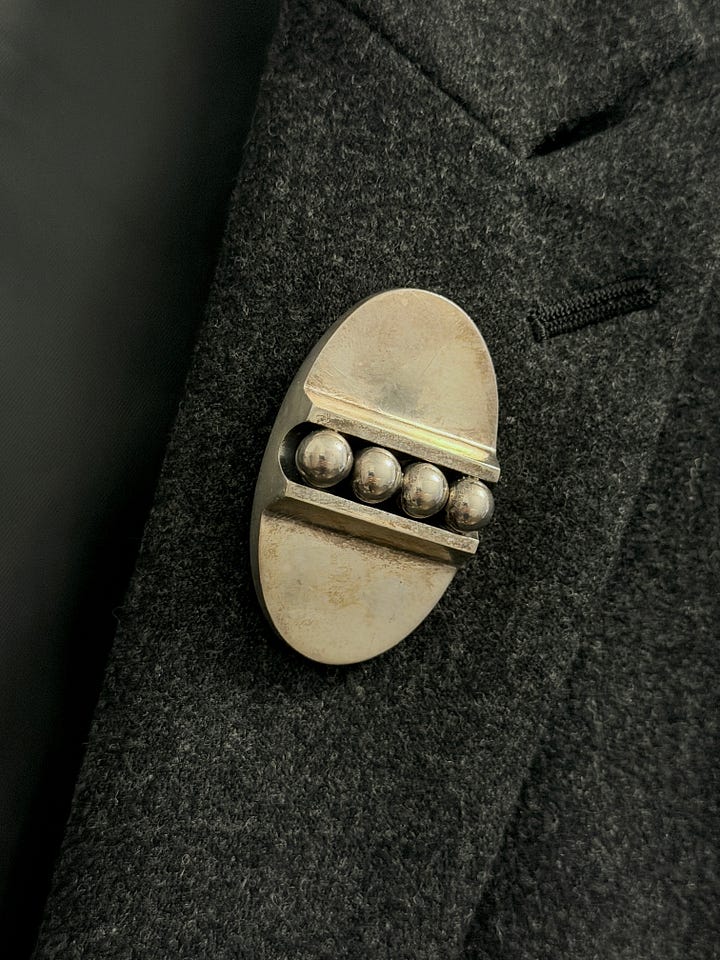 In my research, I found I was most drawn, unsurprisingly, to Modernist mid-century brooches, or new ones that approximated the look of those. In furniture, I’m often more drawn to work from the 1970s, Deco-y stuff from the ‘30s, or radical work from the ‘80s but mid-century was such a sweet spot for silversmithing. There’s a seemingly endless trove of vintage Mexican silver brooches from that time online (as BBSP has pointed out!), plus it’s fun to look at the Calders and Bertoias that sell for bonkers amounts.